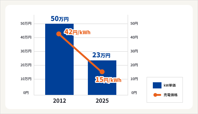 前述のとおり、売電価格は太陽光発電システムの導入コストを考慮して決められています。つまり、売電価格が下がっているということは、太陽光発電システムをそれだけ安く導入できるようになったということでもあります。