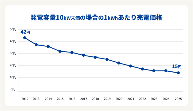 発電容量10kW未満の場合、2012年度(平成24年度)は42円/kWhでしたが、毎年1~4円ずつ下がっていき、2025年度(令和7年度)には半額以下の15円/kWhになっています。