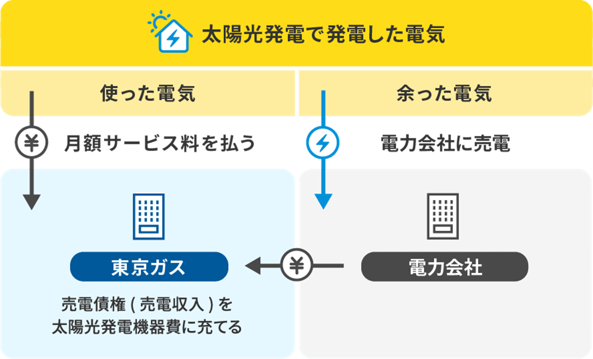 東京ガスが提供する家庭用太陽光発電システムのプランは、2つあります。1つ目は、東京ガスの太陽光発電(一括払いでの機器購入および設置)です。初期費用として機器代と工事費がかかりますが、導入することで昼間の電気代を削減するだけでなく、使いきれずに余った電力を売電して収入を得ることができます。
