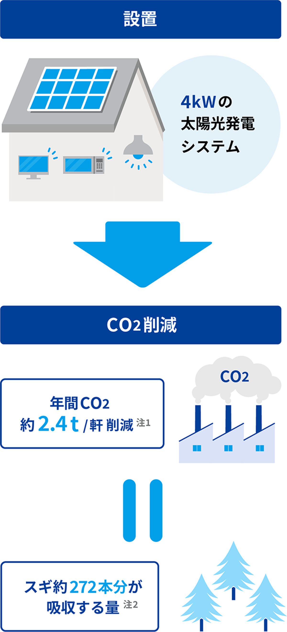 例えば、東京地区で4kWの太陽光発電システムを設置した場合、地球温暖化対策計画に記載された2030年の火力平均係数を用いて試算すると、年間約2.4tのCO2を削減できることがわかります。年間約2.4tのCO2とは、林野庁のホームページよりスギの木が1年間で吸収するCO2の量を用いて試算すると、約272本分の量に相当します。
