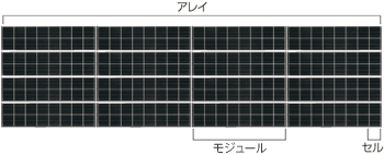 1つひとつの太陽電池は「太陽電池セル」と呼ばれる15cm角ほどの大きさのもので、これを並べて樹脂や強化ガラスで保護したものが「太陽電池モジュール」です。モジュールを屋根の架台に複数枚設置したものは「アレイ」と呼ばれています。