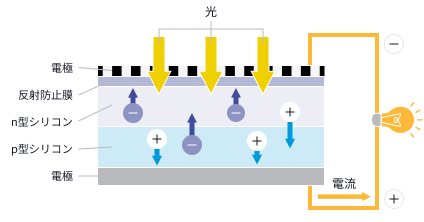 太陽電池はシリコンなどでできた2種類の半導体を重ね合わせたもの。ここに太陽光があたると「+」と「-」が発生し、それぞれの半導体に引き寄せられて電気が発生します。